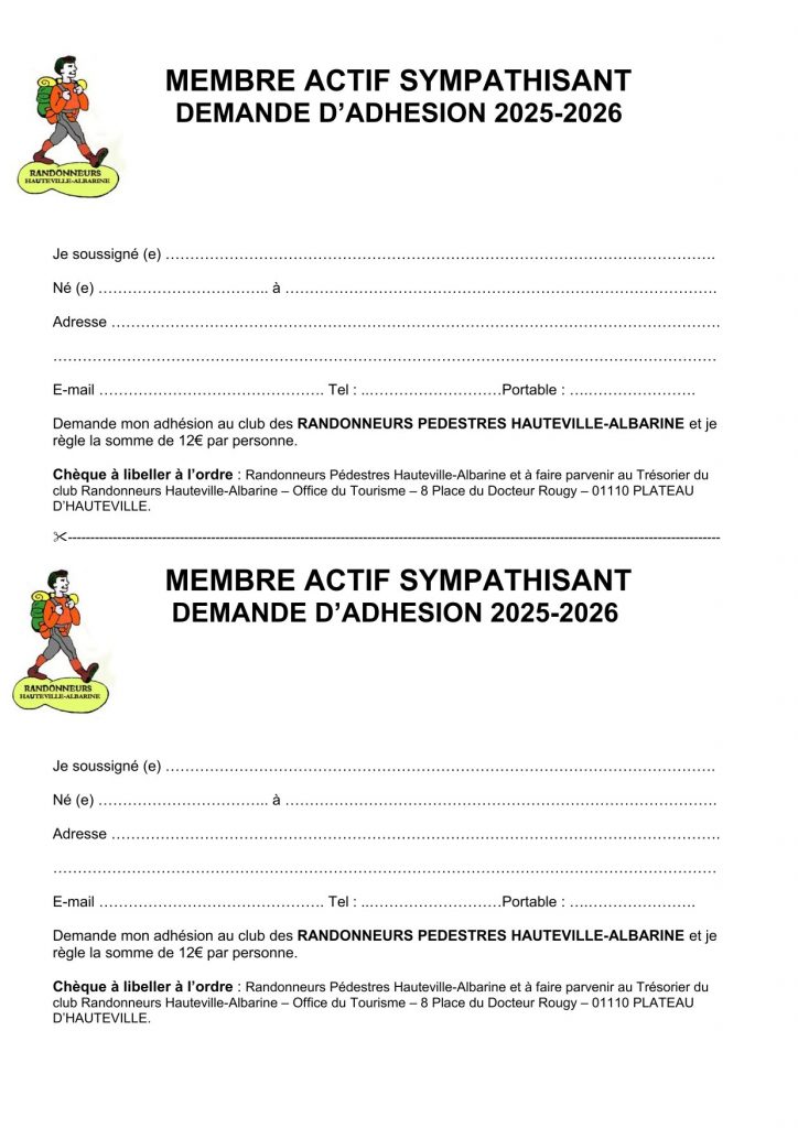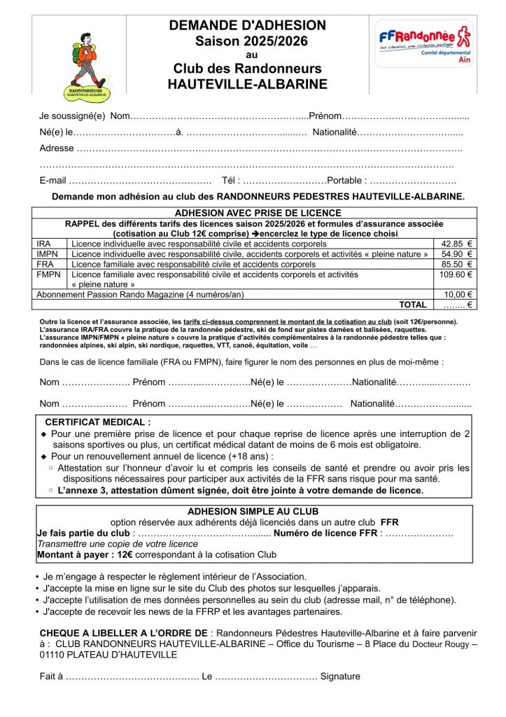 cf demande d’adhésion ci-dessous à remplir et à renvoyer accompagnée du réglement à Club des Randonneurs – Office de Tourisme – 8 Place du Docteur Rougy – 01110 PLATEAU D’HAUTEVILLE .